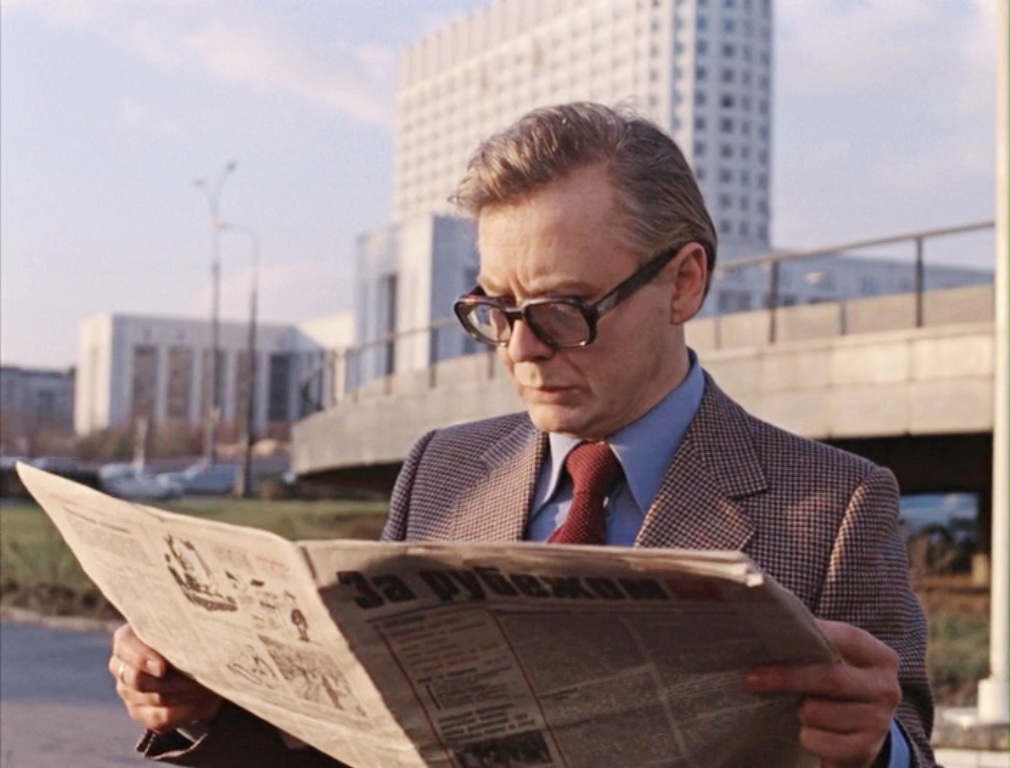 Помотрите на персонажа внимательно. Ждет он Катю, которая подхватывает его на машине, у правительственного здания (Белый дом узнается легко), в советское время там был Совмин РСФСР и Президиум верховного совета РСФСР; то есть профессия вышеозначенного персонажа яснее ясного – он из “министерских”. Следовательно, познакомились они явно на какой-нибудь партийной случке типа съезда или конференции, возможно, в командировке, куда поехали руководящие работники разных отраслей, ну или, что менее вероятно, где-нибудь в правительственном санатории (обычно таких жирных и питательных мужиков жены в одиночестве туда не пущали). Почему мужик этот жирный и питательный? Газета, которую он читает, называется “За рубежом”, то есть человеку нужно быть в курсе “иностранных тенденций”. Одет персонаж очень хорошо – следовательно, с большой долей вероятности он занимается капстранами, следовательно, имеет доступ к отличной одежде и аксессуарам. А еще – он непоправимо, без вариаций женат, потому что разведенных и неженатых за границу не выпускали, а то еще станет “невозвращенцем”. Разведенный же ответственный работник терял репутацию, потому что если он не сохранил семью, то как он сможет сохранять высокие партийные ценности? Так что с самого начала их отношений Кате все должно было быть ясно – он только и исключительно любовник и никто иной.