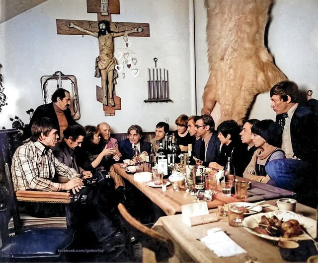 Слева направо: Иван Бортник, переводчик, Тонино Гуэрра, Лора Яблочкина (Гуэрра), Борис Мессерер, Юрий Любимов, Владимир Высоцкий, Белла Ахмадулина, Микеланджело Антониони, Витторио Гори, Андрей Вознесенский, Ирина Кассиль-Собинова, Илья Былинкин.