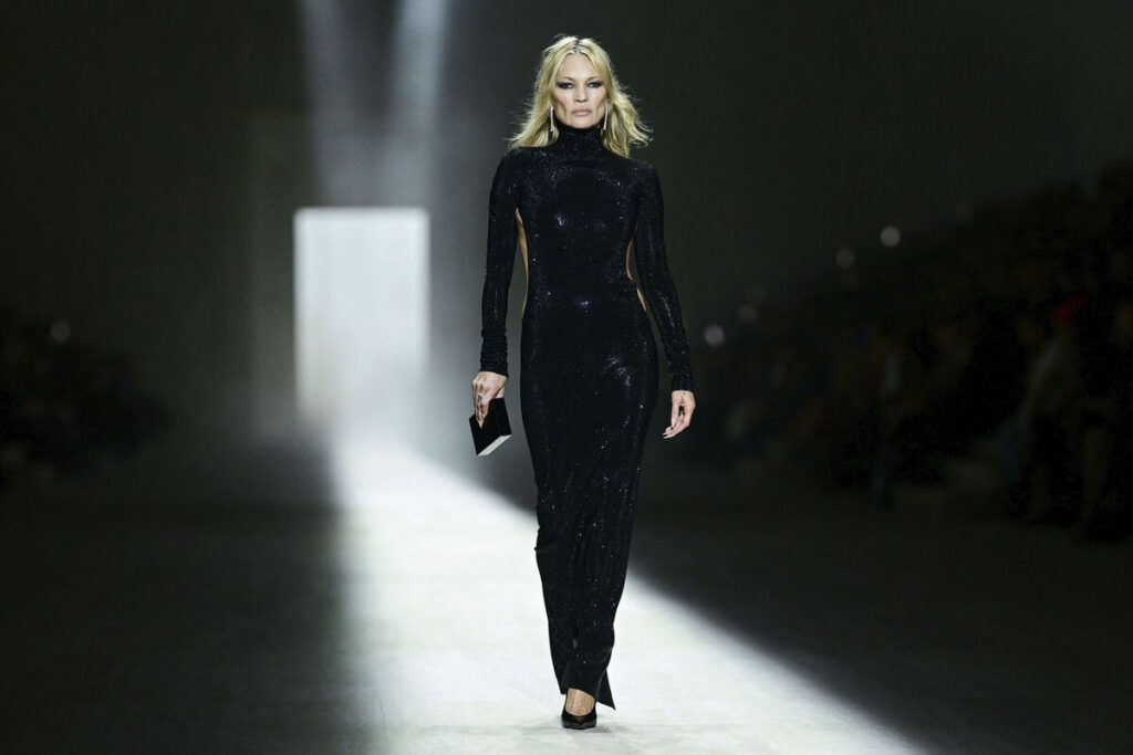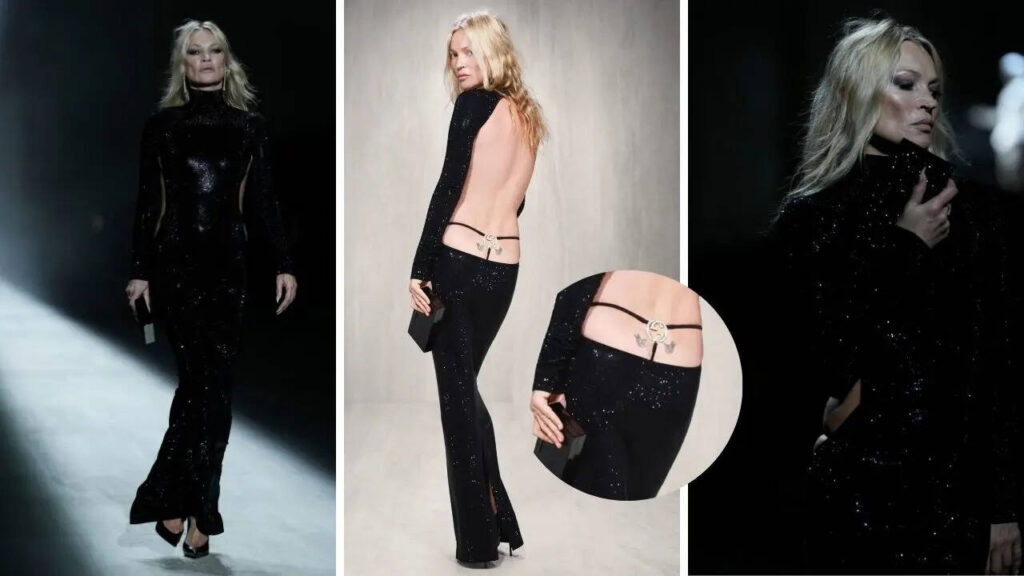 Все-таки действительно не одежда красит человека, а человек одежду. Если сама по себе Мирей Дарк – шикарная женщина, действительно класса “о-лала”, то на ней платье с самым глубоким вырезом будет смотреться как игривый французский шик, сногсшибательно сексапильный, но держащий мужчину не просто на расстоянии, а не дающий ему ни шанса ляпнуть какую-нибудь скабрезность, то престарелая прокуренная Мосс, просравшая все свои данные лет 15 назад, с унылыми формами и выражением лиТСа “кажись, я вступила в говно и мне воняет” хоть в этом платье, хоть в оригинальном платье Лароша – будет смотреться как случайно обнаружившая на помойке вечернее платье бомжиха, решившая поразить почтенное сообщество собутыльников своим волшебным появлением из-за кучи опарышей.